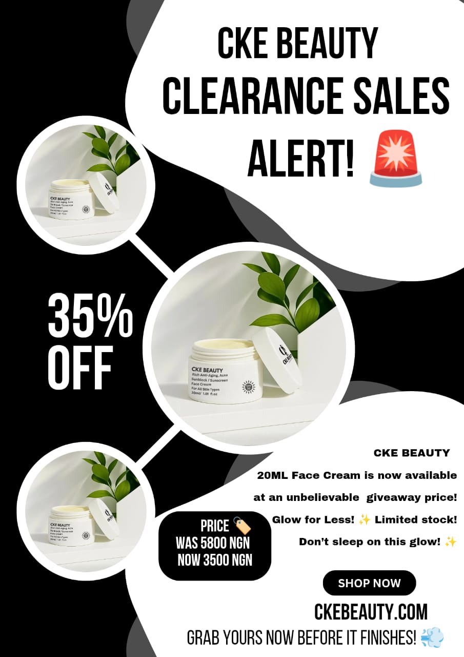 I was having serious Pimples/acne so I see CKE Beauty Advert on Facebook and I decided to the their Rich Anti-aging Acne Sunblock/Sunscreen Face Cream and it cleared everything for me, I'm super excited I'm done with my insecurities and I can come out boldly with face even if I don't do make up 🤩